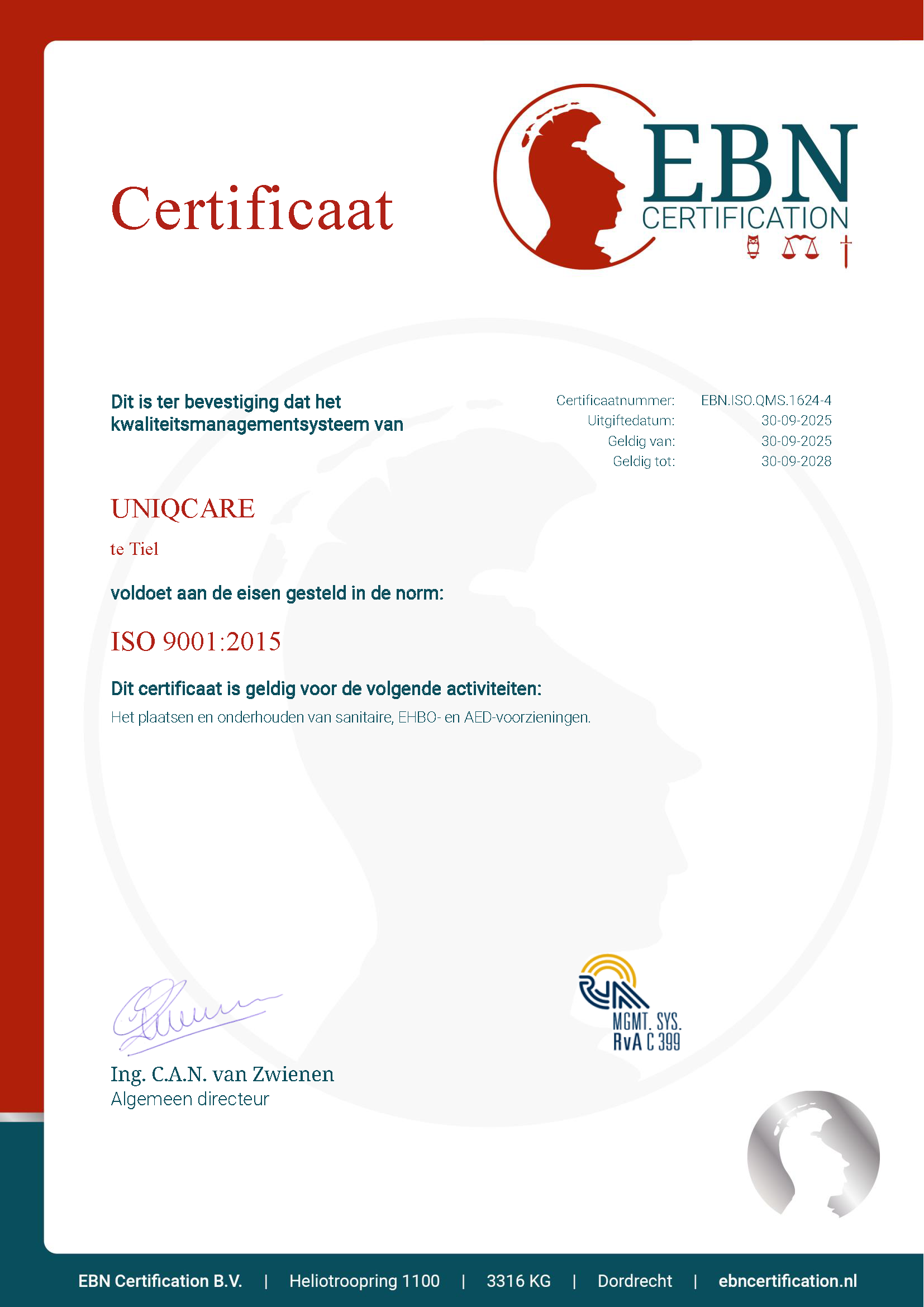 Op basis van het certificatie-onderzoek is verklaard* dat het milieumanagementsysteem van Uniqcare voldoet aan de voorwaarden gesteld in NEN-EN-ISO 14001:2015 en het SCCM certificatiesysteem milieumanagementsystemen voor het toepassingsgebied ‘het plaatsen en onderhouden van sanitaire, EHBO- en AED-voorzieningen’.